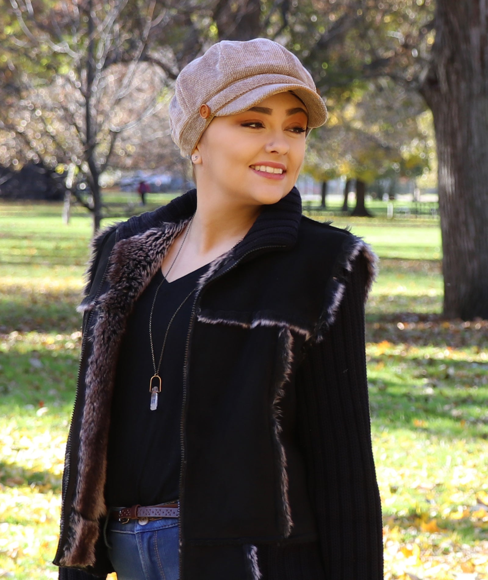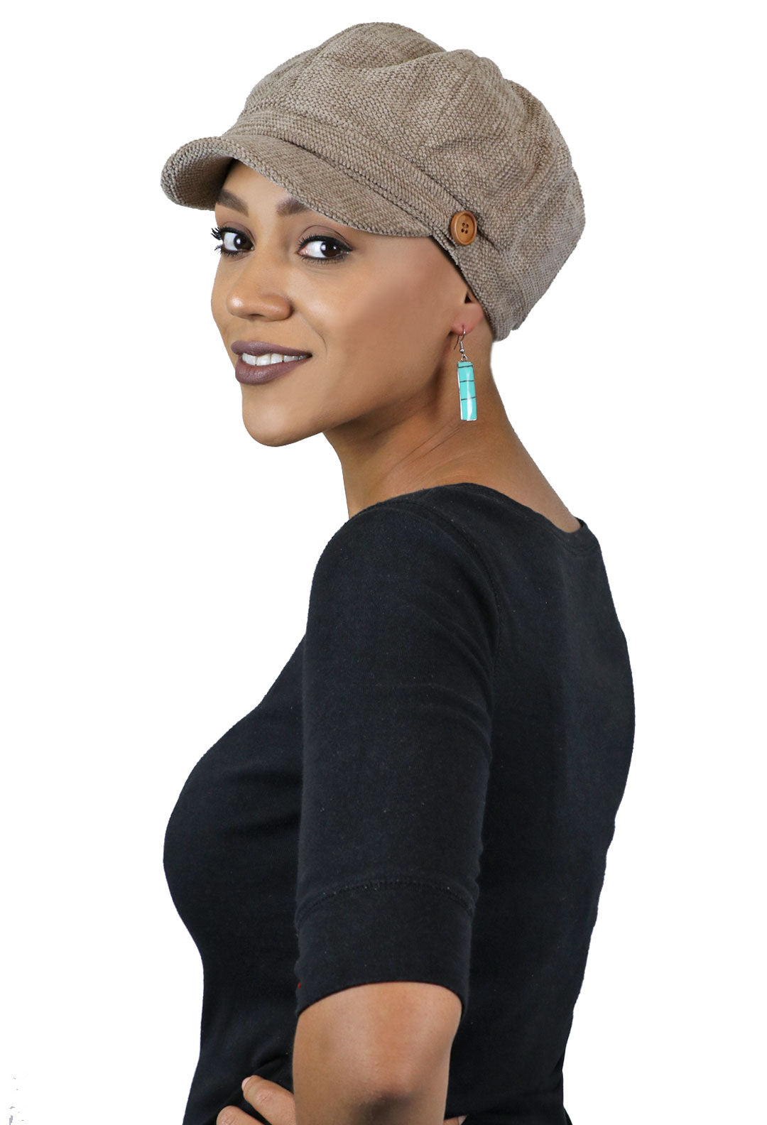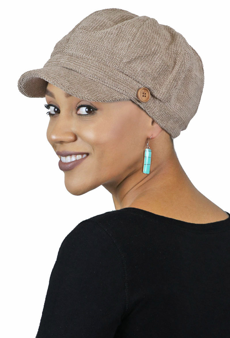 Why we love it: Full coverage and soft interior are a must in chemo headwear. Newsboy or Cabbie hats are great for chemo patients and women with hair loss because they naturally have shape and fullness on top and more coverage over the ears and neckline that a baseball cap or cadet hat.