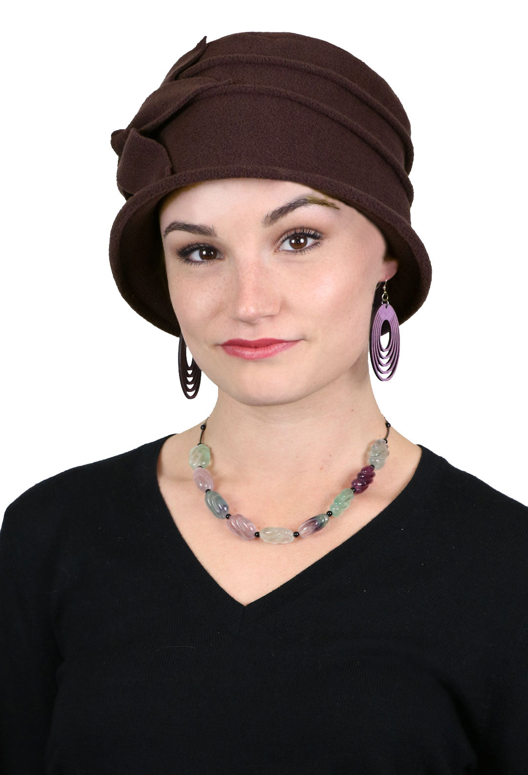 This beautifully soft, lightweight fleece hat for women is a sweet go-to hat for fall and winter. With full coverage over the ears and neck this chic cloche hat makes a perfect hat for cancer patients.