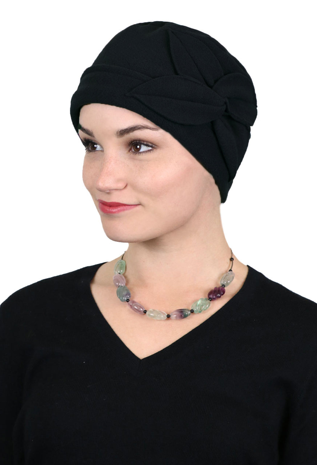 With more grace and style than a standard chemo turban, this cuddly soft winter hat for women has a sewn down cuff for double thickness over your ears and an artisan butterfly design.