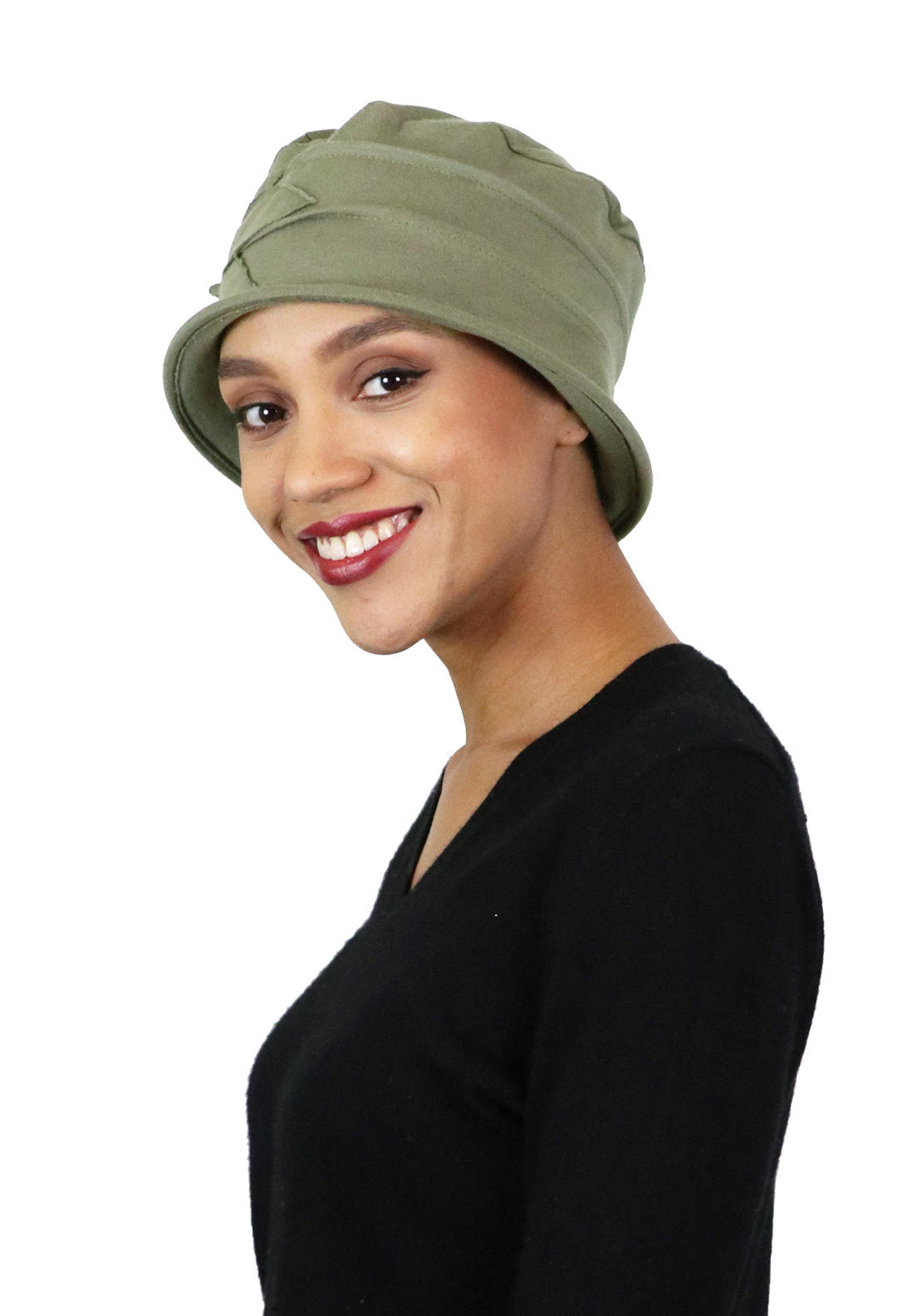 Love my olive cotton cloche. It has an unique style but it's the brim I like the most. With this hat the brim fits lower in the back covering much more. Yet it doesn't shift when setting back into a recliner.