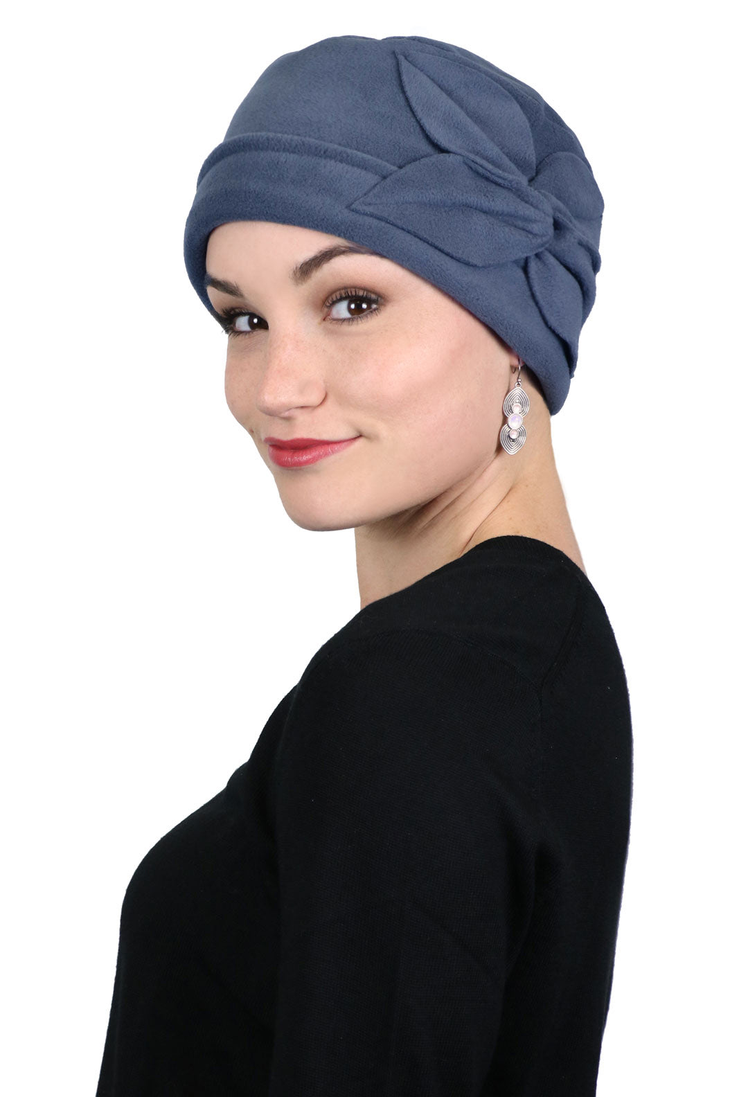 A sweet go-to hat for fall and winter. Can be worn indoors or out as a chemo cap on chilly winter nights. 100% polyester fleece.